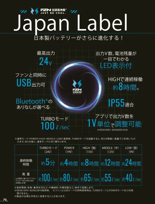 日本製品質にこだわったJapan Labelの24Vリチウムイオンバッテリー単体モデルです。最高出力24Vに対応し、強力な送風性能を安定して支える高性能設計。Bluetooth非対応のシンプル仕様で、業務用途に適した信頼性と扱いやすさを兼ね備えています。