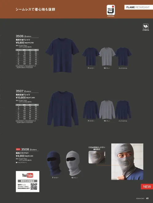 高機能難燃素材Protex® Fiberを使用したホールガーメント仕様の難燃バラクラバです。モダクリル55%・綿45%の難燃ニット素材により高い耐熱性と快適な着用感を両立。無縫製の立体編み構造で肌当たりがやさしく、口元は呼吸しやすい編地設計を採用。JIS T8022 A1+A2相当の耐炎性能を備えています。