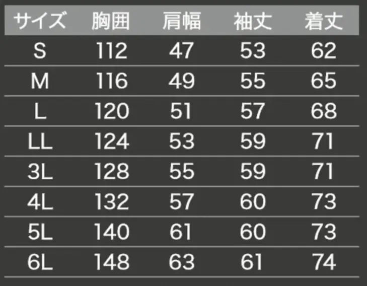 難燃長袖ブルゾン 旭蝶繊維3602のサイズ表