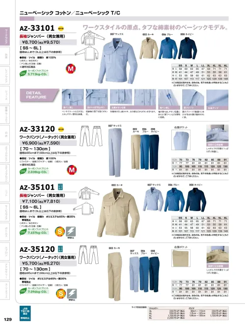 ワークパンツ(ノータック)(男女兼用) アイトスAZ-35120-Aのサイズ表