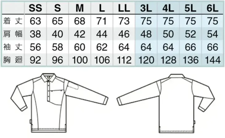 長袖ポロシャツ(男女兼用) アイトスAZ-50019のサイズ表
