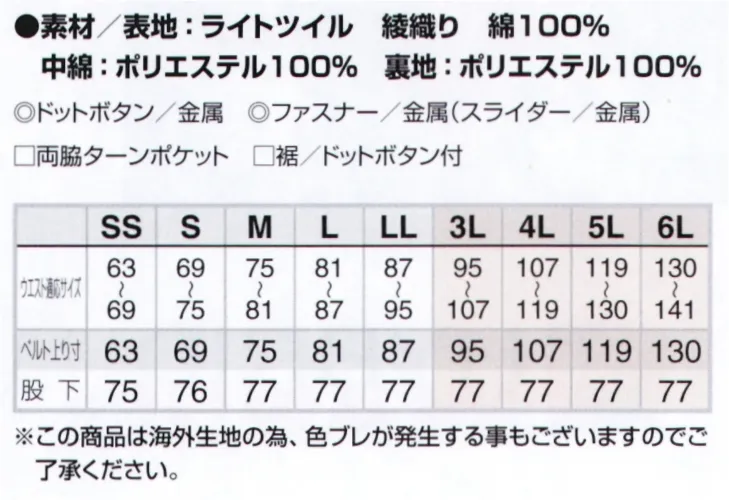 防寒パンツ(男女兼用) アイトスAZ-8572のサイズ表
