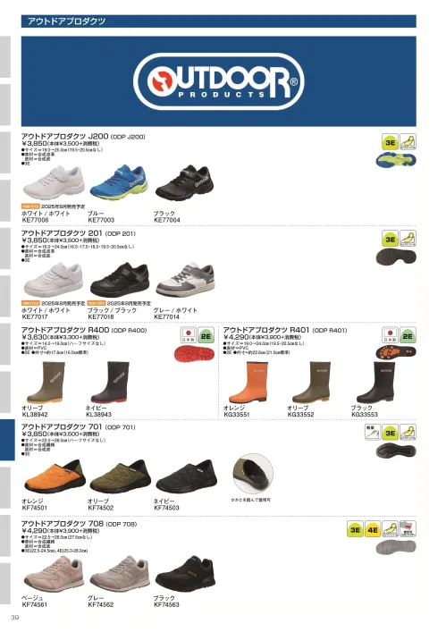アウトドアプロダクツ J200 ホワイト/ホワイト アサヒシューズKE77006のサイズ表