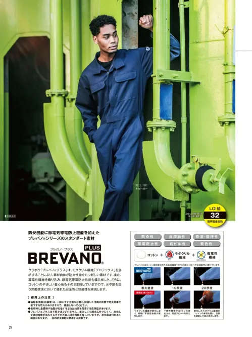 クラボウの高機能防炎素材BREAVANO PLUS(ブレバノプラス)を採用した防炎つなぎ服。綿55%・モダクリル45%の混紡により約690g(Lサイズ)の軽量設計と優れた難燃性能を両立。通気性とやわらかな着心地で暑熱環境でも負担を軽減し、安全性と快適性を兼ね備えた現場向けプロ仕様です。