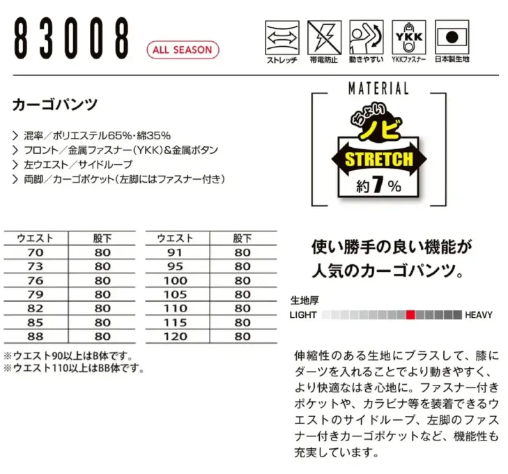 年間物カーゴパンツ(83008) 山田辰83008のサイズ表