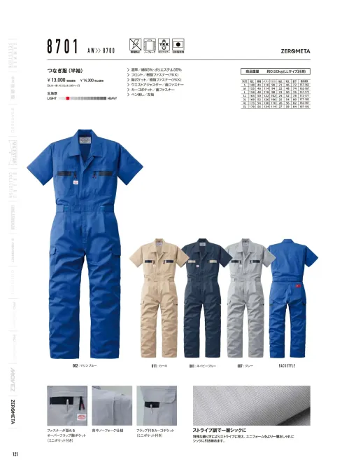 ストライプ半袖ツヅキ服(1-8701) 山田辰8701のサイズ表