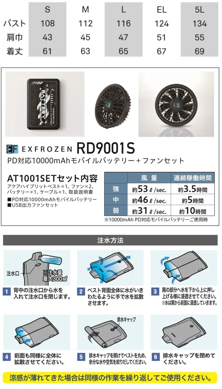 ・セット内容:アクアハイブリッドベスト、ファン2個、バッテリー、ケーブル、取扱説明書