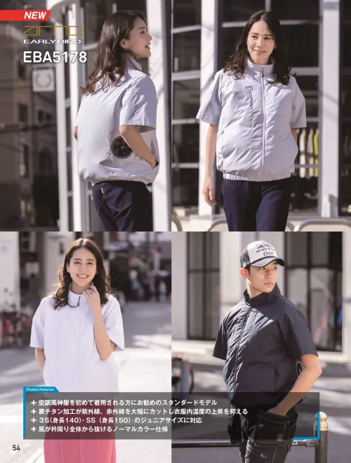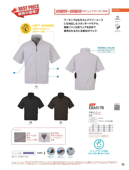 ワークシーンはもちろん、普段使いにも対応したスタンダードモデル。3S(140)・SS(150)のジュニアサイズも展開しており、電動ファン付きウェアを初めて着用する方にもおすすめです。