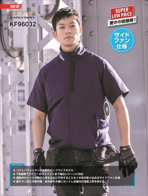 コストパフォーマンスに優れたユーティリティモデル。ポリエステル100%タフタ素材に裏チタン加工を施し紫外線と赤外線を大幅にカット。サイドファン仕様により運転時のシートや背もたれに干渉しにくく外気を効率よく取り込み、暑い作業現場でも衣服内を快適に保ちます。