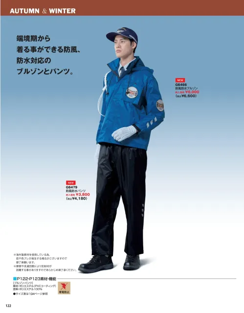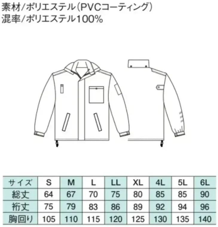 端境期から着用できるG6466 防風防水ブルゾンは、風雨をしっかり遮るPVCコーティング素材を採用した警備業務向けアウターです。ポリエステル100%の防風・防水仕様に加え、帯電防止機能も備え、天候が変わりやすい屋外現場でも安定した着用感と安全性を確保します。