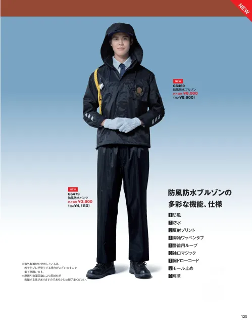 端境期から着用できるG6469 防風防水ブルゾンは、風雨をしっかり遮るPVCコーティング素材を採用した警備業務向けアウターです。ポリエステル100%の防風・防水仕様に加え、帯電防止機能も備え、天候が変わりやすい屋外現場でも安定した着用感と安全性を確保します。