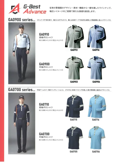 警備服ブランドG-Best Advanceシリーズの半袖ポロシャツ。ポリエステル100%素材を使用し、軽やかな着用感と通気性を確保。屋外業務や長時間の立ち仕事でもムレにくく、清潔感のある見た目をキープします。