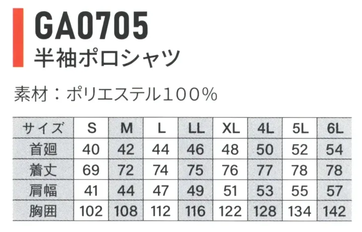 半袖ポロシャツ ネイビー ベストGA0705のサイズ表
