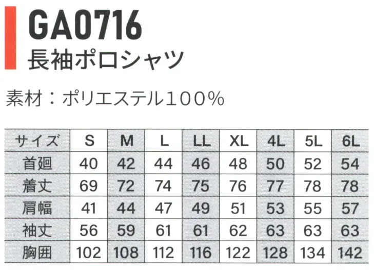 長袖ポロシャツ ブルー ベストGA0716のサイズ表