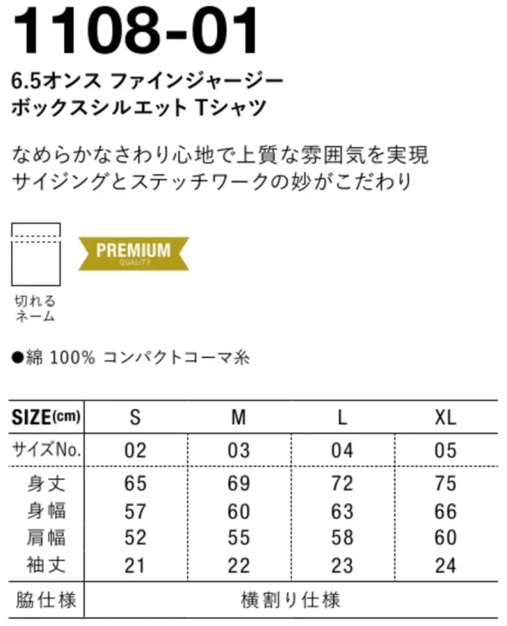 1108-01 6.5オンス ファインジャージー ボックスシルエット Tシャツ
