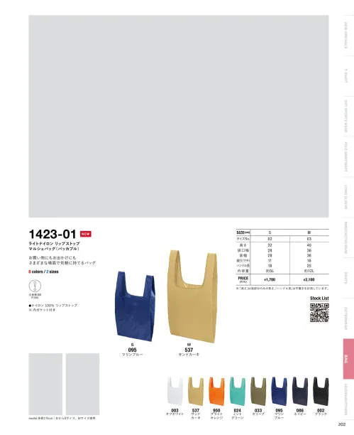 1423-01 ライトナイロン リップストップ マルシェバッグ(パッカブル)