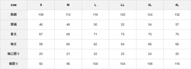 エアライトニット ワークフルジップパーカー CUC700109のサイズ表