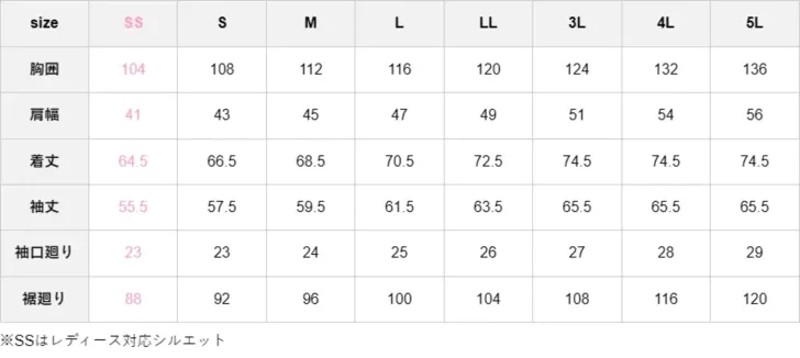 サイズ:SS~5L(SSサイズはレディース対応シルエットです)