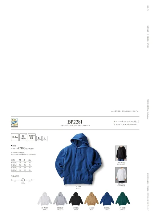 レギュラーウェイトビッグシルエット P/O パーカ フェリックBP2281のサイズ表