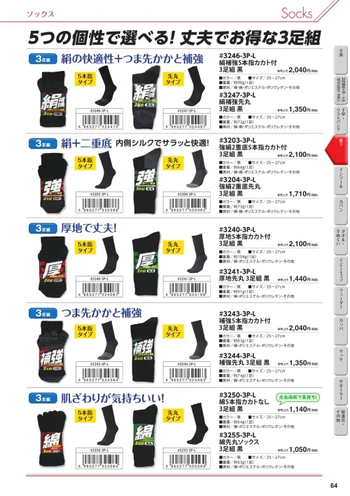 作業服JP 綿 5本指カカトなし 3足組 福徳産業 3250-3P-L 作業服の専門店
