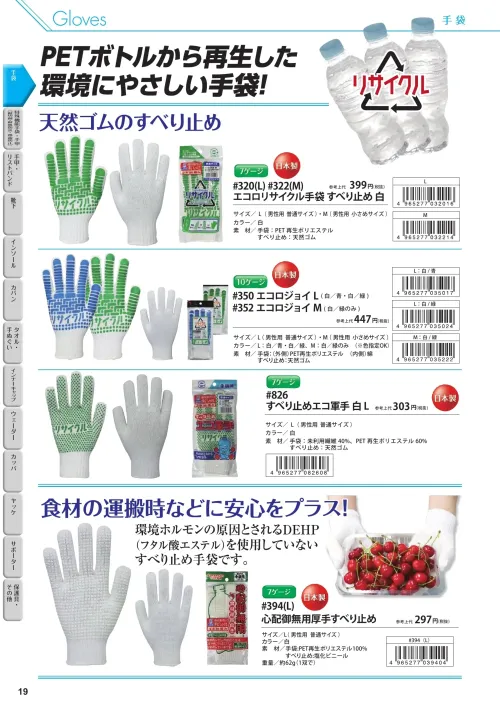 PETボトルから再生した糸で作った薄手タイプの手袋。天然ゴムのすべり止め付。