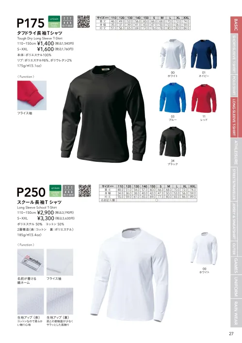 タフドライ長袖Tシャツ wundouP-175のサイズ表