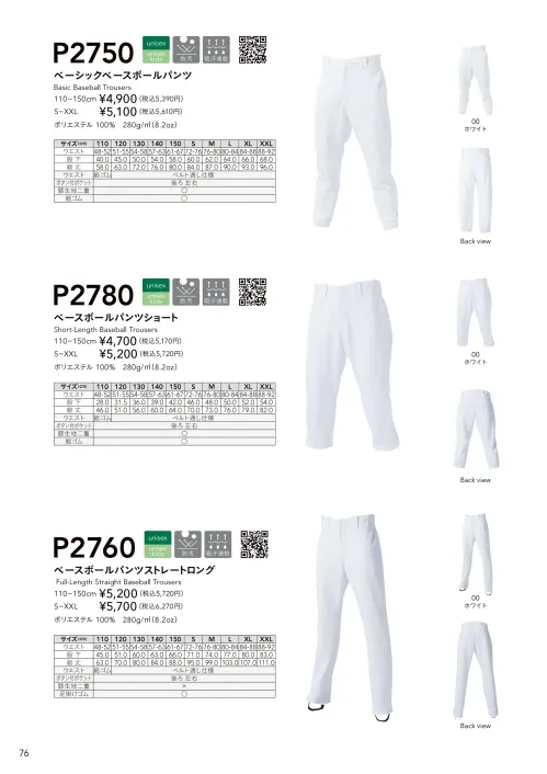 ベーシックベースボールパンツ wundouP-2750のサイズ表