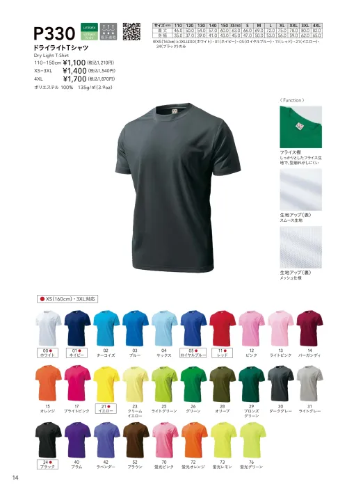 ドライライトTシャツ wundouP-330-Cのサイズ表