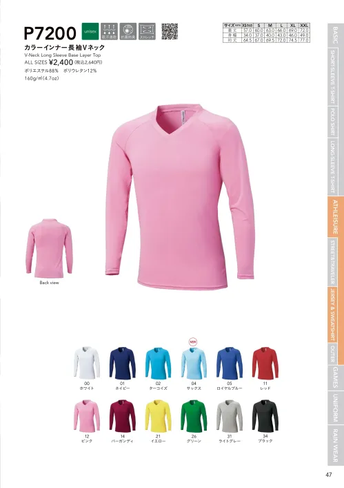 カラーインナー長袖Vネック wundouP7200-Bのサイズ表