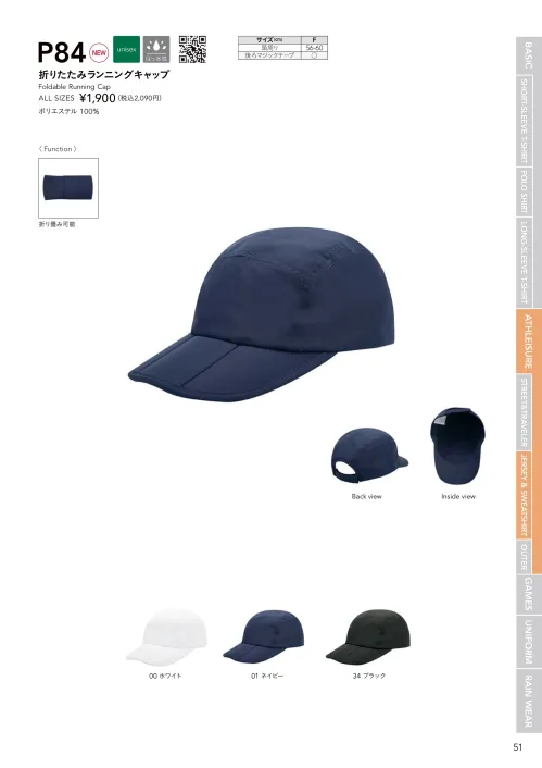 軽量で持ち運びしやすいユニセックス対応の折りたたみランニングキャップです。ポリエステル100%素材を使用し、はっ水性を備えた実用的な設計。折りたたんでコンパクトに収納できるため、ランニングや屋外作業、イベント時のサブアイテムとしても活躍します。