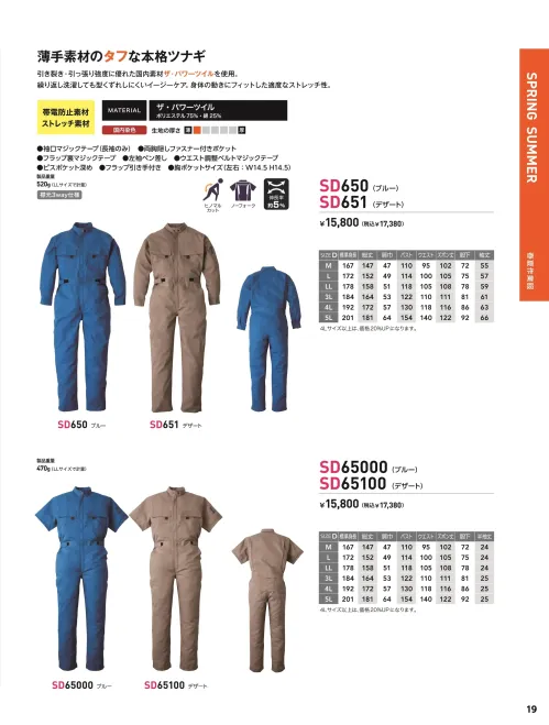 長袖ツナギ(夏服)(SD650) ソルディ(日の丸)650のサイズ表