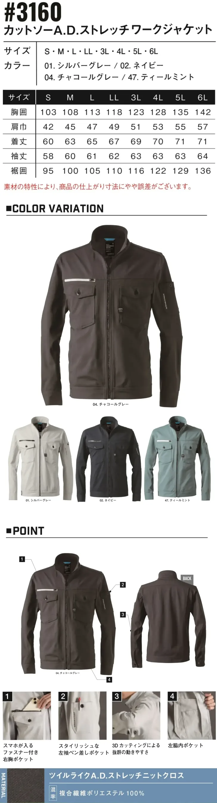 カットソーA.D.ストレッチワークジャケット アイズフロンティア3160のサイズ表
