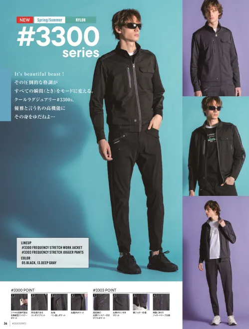 高機能素材IZ FRONTIERの春夏対応ワークジャケット。ナイロン79%ポリウレタン21%のトリコット素材により、伸長率タテ約42.3%ヨコ約105%の高ストレッチ性を実現。接触冷感とUVカット機能を兼ね備え、軽やかな着心地と動きやすさで暑い現場でも快適なパフォーマンスをサポートします。