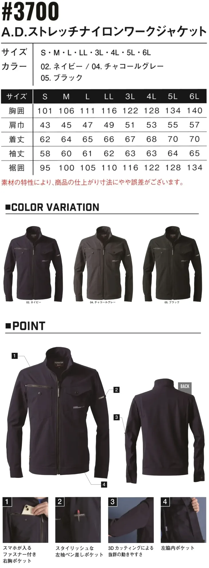 A.D.ストレッチナイロンワークジャケット アイズフロンティア3700のサイズ表
