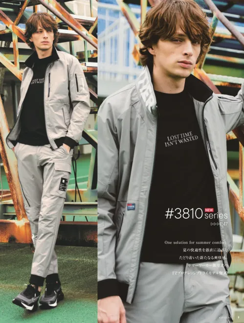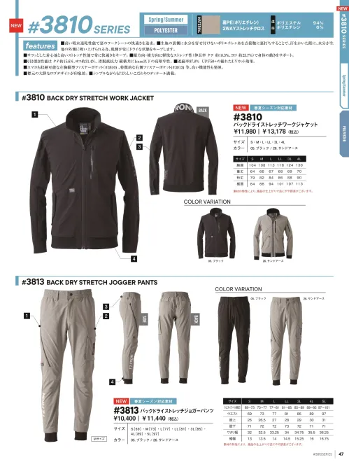 春夏シーズンに最適な3810シリーズのバックドライストレッチワークジャケット。ポリエステル94%・ポリエチレン6%の2WAYストレッチ素材を採用し、伸長率タテ約18.3%ヨコ約25.7%で軽快な動きをサポート。裏面のポリエチレン構造により汗を外側へ逃がし、常にドライな着心地をキープします。