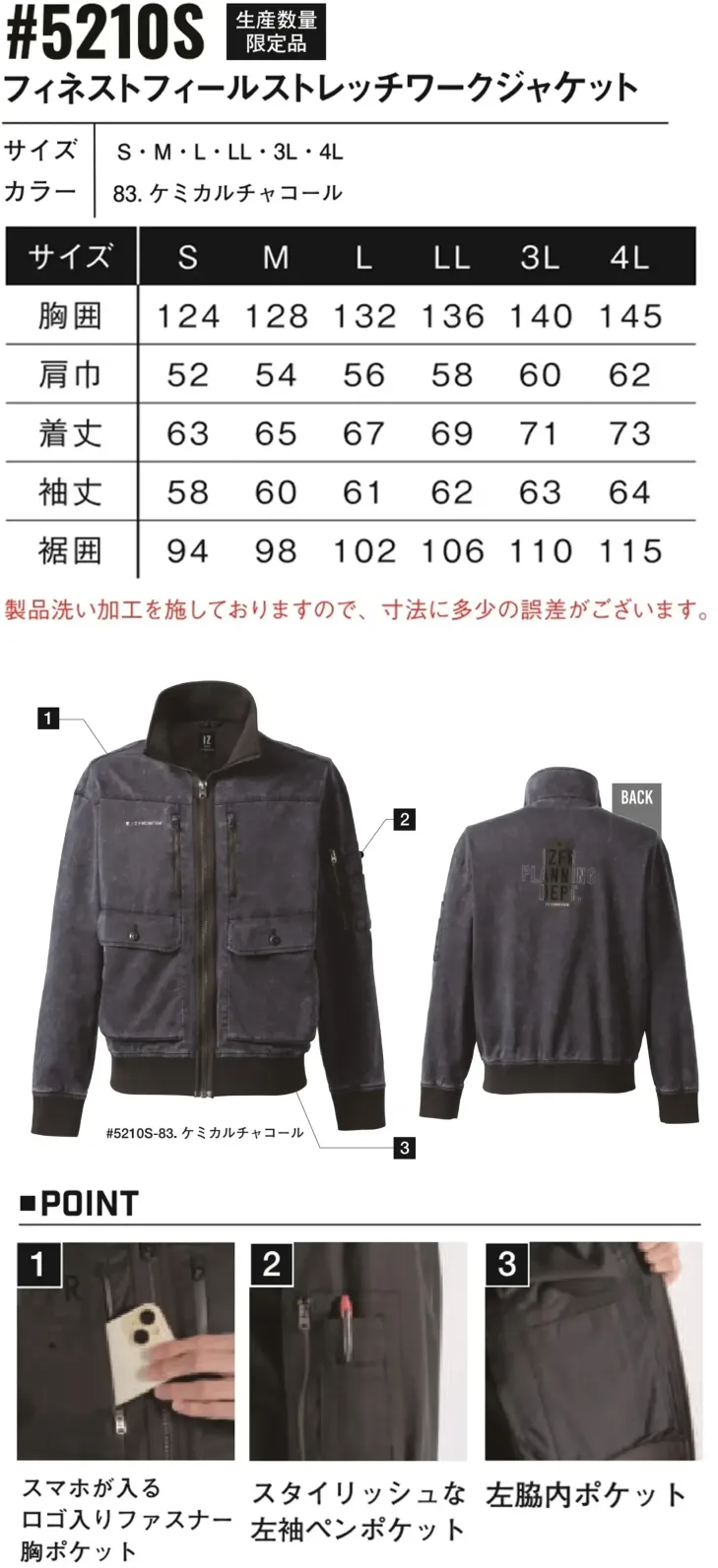 フィネストフィールストレッチワークジャケット アイズフロンティア5210Sのサイズ表