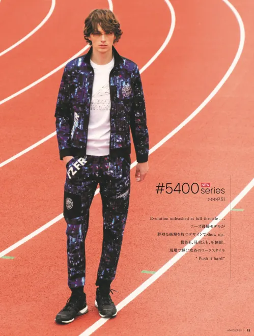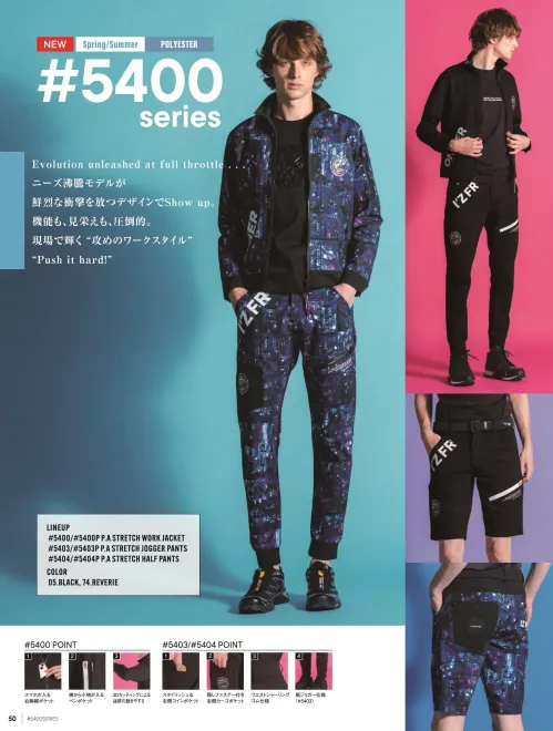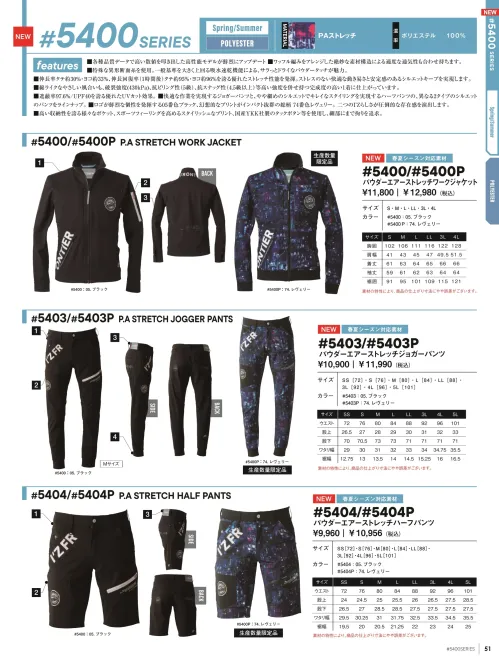 春夏対応の5400シリーズパウダーエアーストレッチワークジャケットの限定モデル。ポリエステル100%のPAストレッチ素材を採用し、伸長率タテ約30%ヨコ約33%の高ストレッチ性能を実現。吸水速乾性に優れたパウダータッチのドライな着心地で、快適さとスタイリッシュなシルエットを両立します。