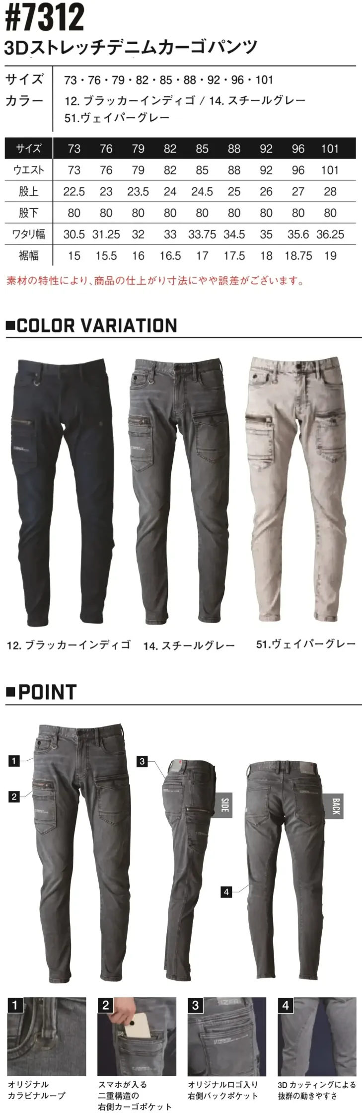3Dストレッチデニムカーゴパンツ アイズフロンティア7312のサイズ表