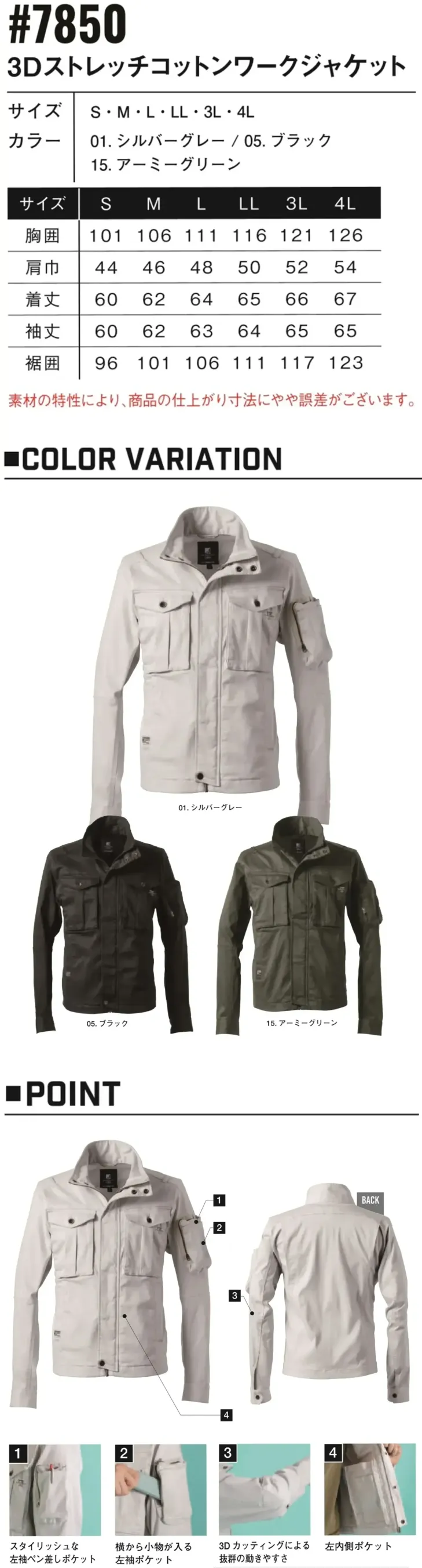 3Dストレッチコットンワークジャケット アイズフロンティア7850のサイズ表