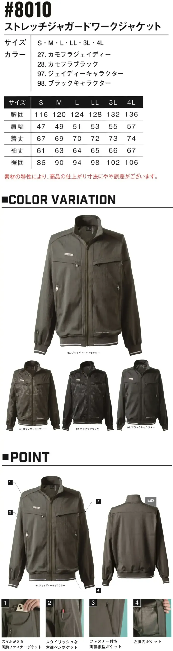 ストレッチジャガードワークジャケット アイズフロンティア8010のサイズ表