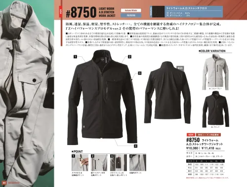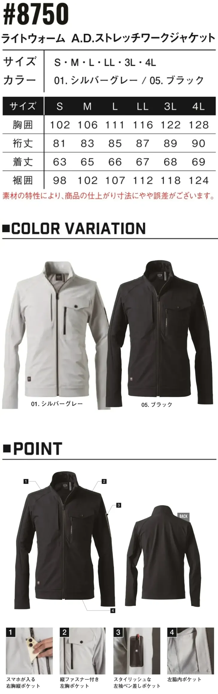 ライトウォームA.D.ストレッチワークジャケット アイズフロンティア8750のサイズ表