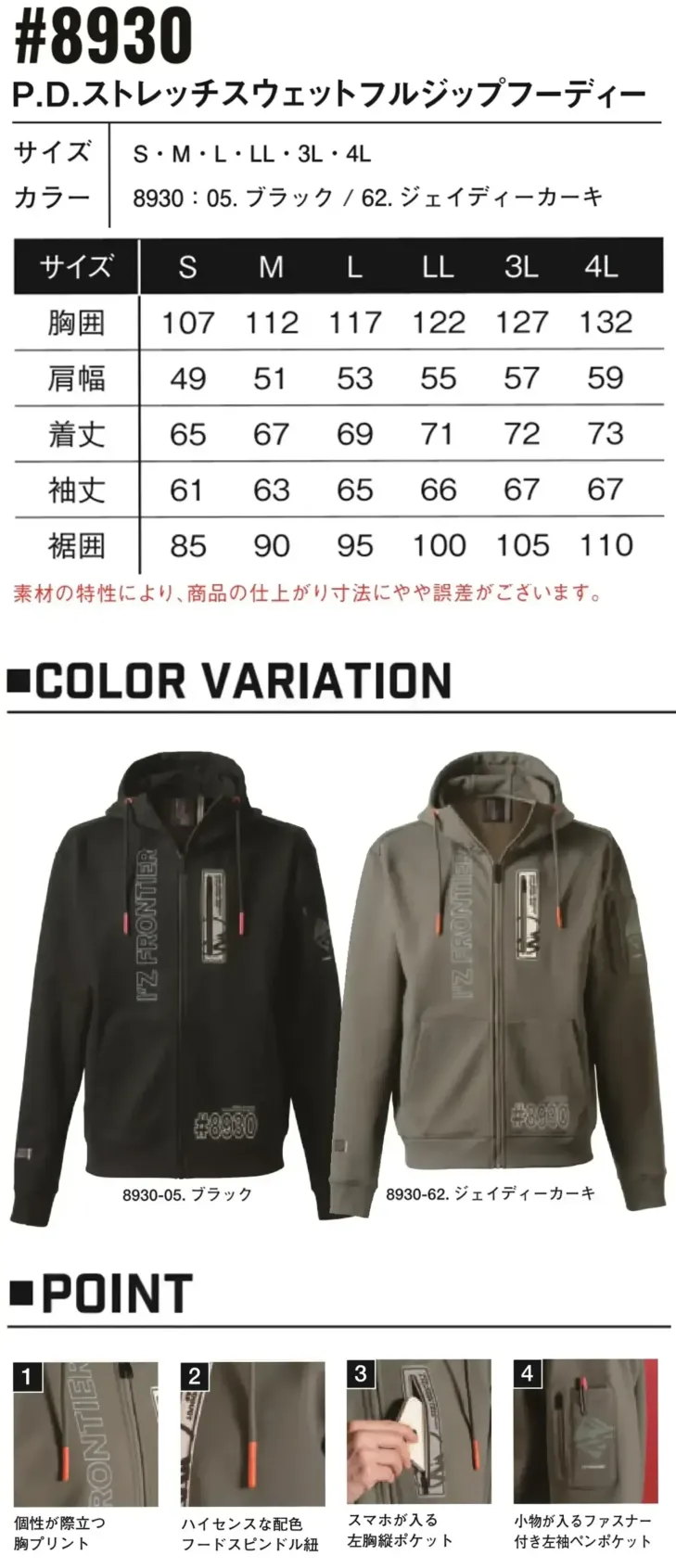 P.D.ストレッチスウェットフルジップフーディー アイズフロンティア8930のサイズ表