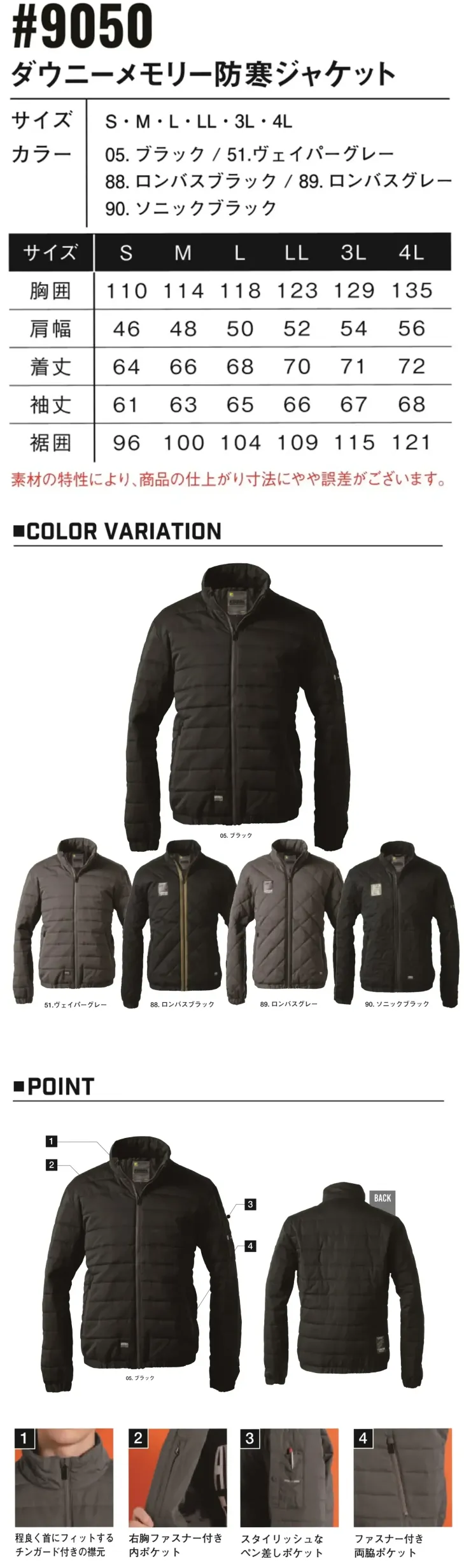 ダウニーメモリー防寒ジャケット アイズフロンティア9050のサイズ表