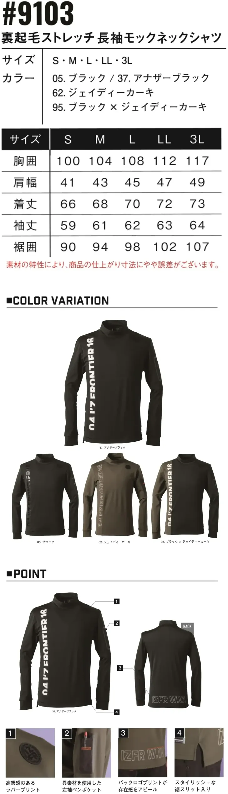 裏起毛ストレッチ長袖モックネックシャツ アイズフロンティア9103のサイズ表