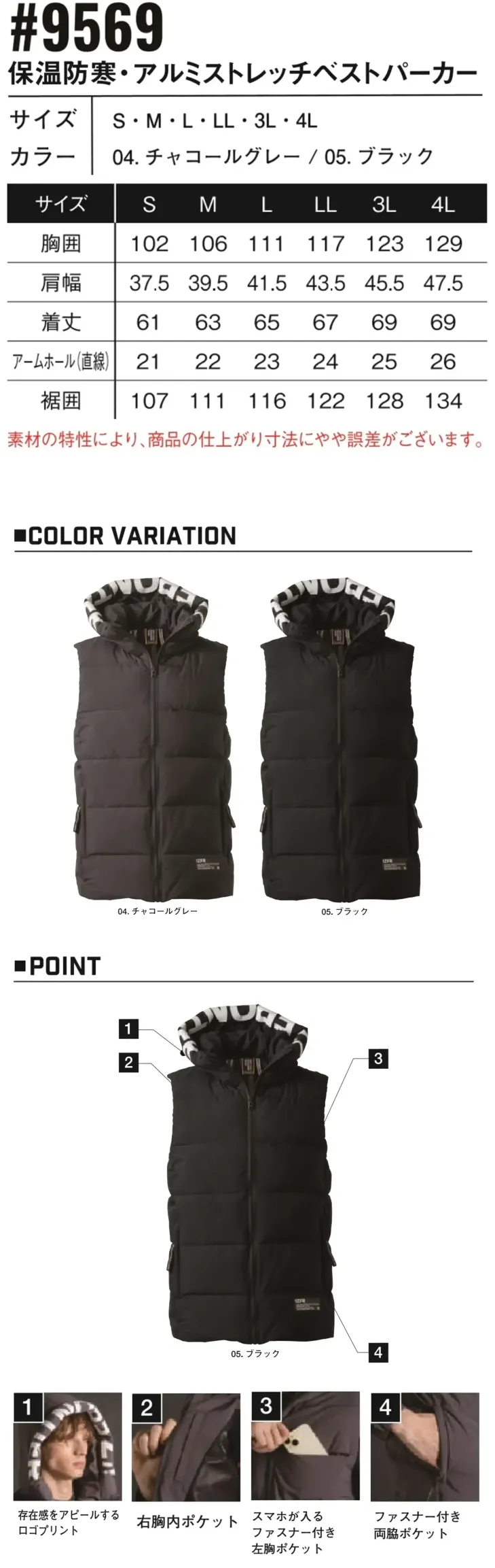 保温防寒・アルミストレッチベストパーカー アイズフロンティア9569のサイズ表