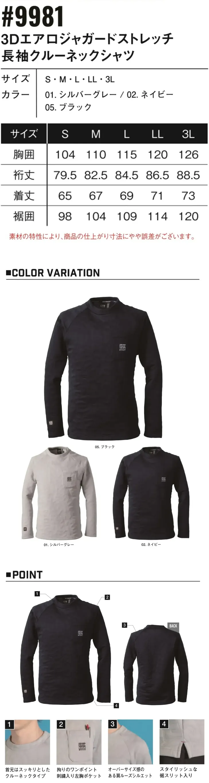 3Dエアロジャガードストレッチ長袖クルーネックシャツ アイズフロンティア9981のサイズ表