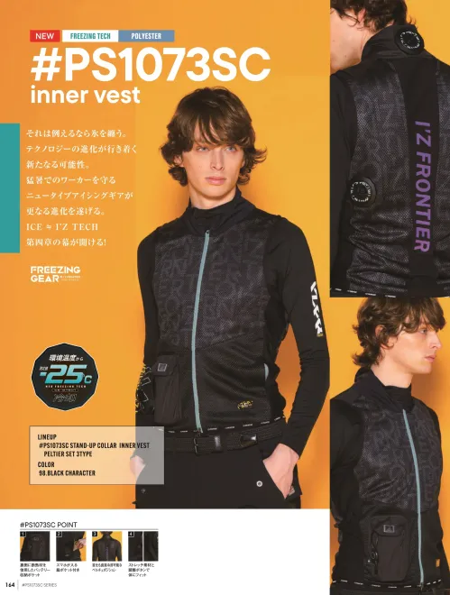IZ FRONTIERの冷却デバイス対応ウェアとして開発された立ち衿インナーベストに、ペルチェデバイス3個と専用バッテリーを組み合わせたセットモデル。最大約-22℃の冷却性能と高通気メッシュ構造により、猛暑環境でも効率的に身体をクールダウンし快適な作業を実現します。
