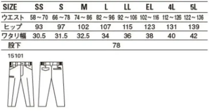 エコ製品制電ストレッチノータックパンツ 自重堂15101のサイズ表