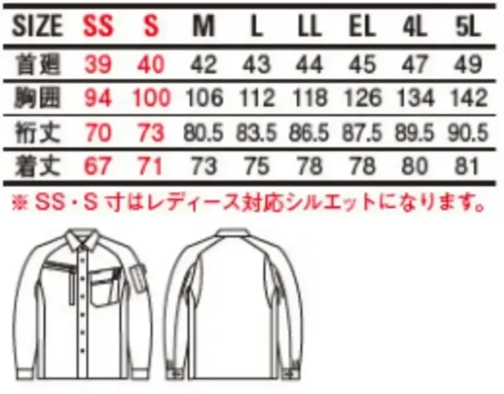 エコ製品制電ストレッチ長袖シャツ 自重堂15104のサイズ表