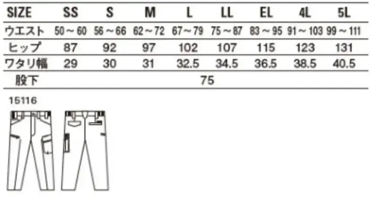 エコ製品制電ストレッチレディースカーゴパンツ 自重堂15116のサイズ表